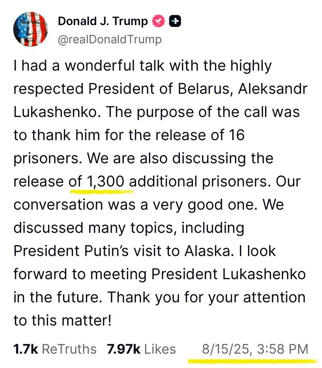 Мы приветствуем Ваши инициативы, направленные на прекращение войны. В то же время мы с уважением просим Вас в ходе встречи с Президентом Путиным поднять вопрос об освобождении политических заключённых в Беларуси, где более 1 300 человек находятся в незаконном заключении. Президент Путин мог бы решить этот вопрос в течение нескольких минут, если бы пожелал этого.